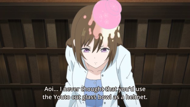 — Somehow, in all that commotion, the bowl of ice cream landed on Aoi’s head. It’s a good look. Don’t anime girls like to wear tiny hats?
