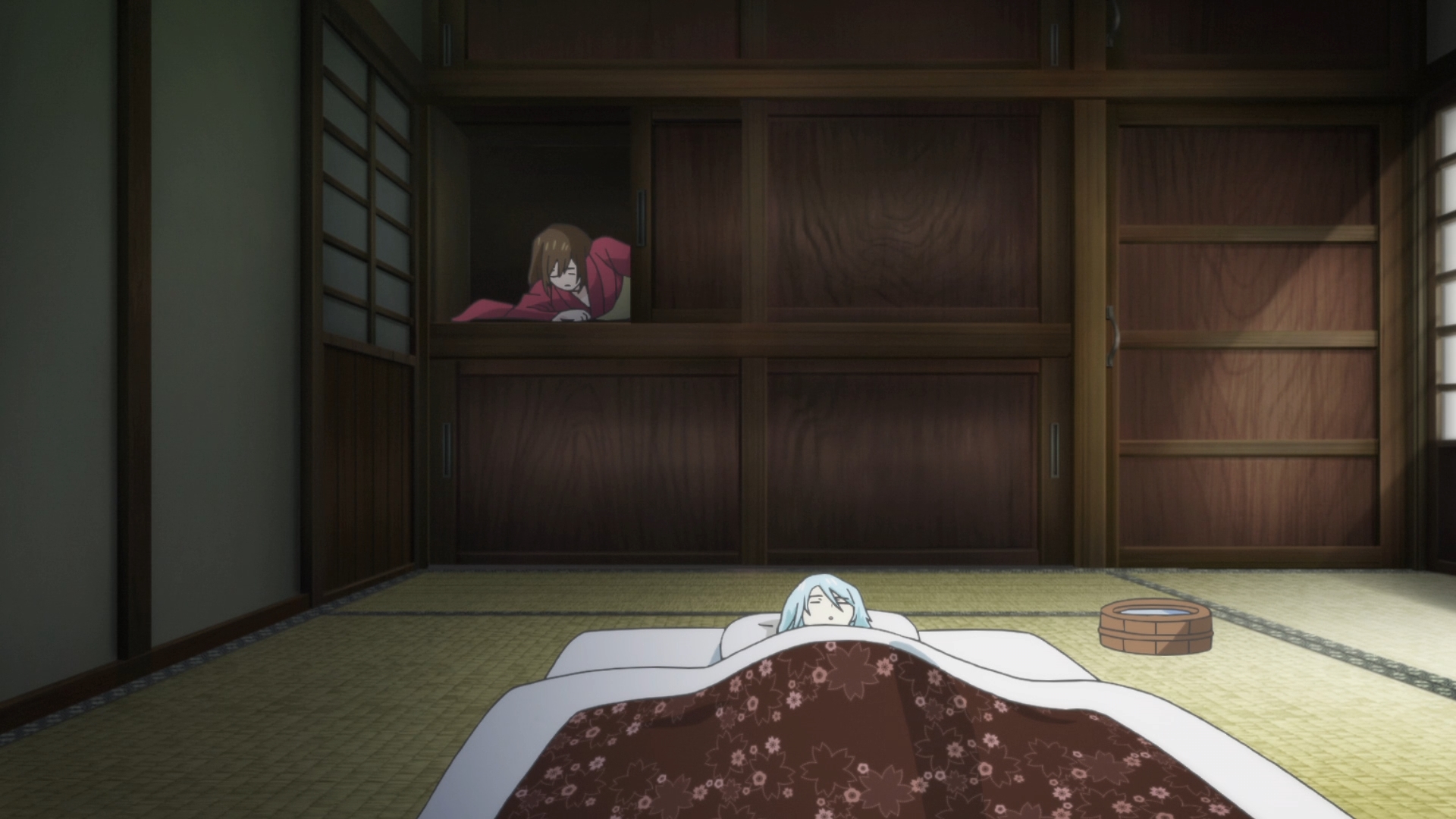 — So Oryo got a fever, because snow women can’t go near fire. When did she go near a fire, you ask? Remember these terrible-looking fires from last week’s episode? Yep, they were enough to give the girl a fever. Still, what does this have to do with Aoi? Why does our heroine have to take care of Oryo of all people? Let’s not also forget that the former young hostess tried to get Aoi killed.