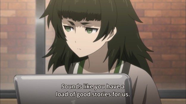 — Elsewhere, Maho is rightfully concerned about Rintaro and his potential inability to tell Amadeus apart from the real Kurisu. On the one hand, Alexis doesn’t know that Rintaro’s kind of fucked up in the head. Maybe if he knew, he wouldn’t have pushed for our hero to participate in this experiment. But on the other hand, I still feel as though he should’ve done his homework. Maybe interview Rintaro a couple more times to assess his mental state. Maybe even consult a psychologist and see what they might think. After all, Amadeus doesn’t just have some random girl’s memories. It has a dead girl’s memories, and you’re asking someone who used to know her to get into a relationship with an AI. Unfortunately, Alexis is one of those scientists in fiction who is so eager for data that he never considers the potential ramifications of their actions.
