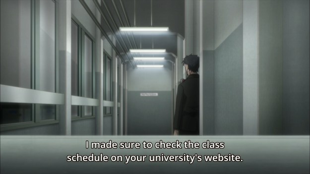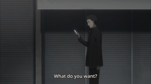 — Elsewhere, Rintaro has to tell Amadeus to stop calling him so often. The AI is quite persistent, though. It knows when he is and isn’t free by checking his class schedule. Why would it know his schedule? Does Amadeus pretty much have free reign over his phone just because he installed the app? That’s pretty bad design, guys.
