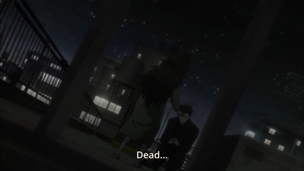 — Maho storms up to the roof, shuts Amadeus off, and finally says what she have said a long time ago and in much more delicate terms. She yells at the guy that Kurisu is dead. Amadeus is Amadeus, and Kurisu is dead. She was hoping to give the guy a much needed wake-up call, but because she really knows nothing about him or what he’s been through, she inadvertently triggers Rintaro instead. All of a sudden, his mind is flooded with all the horrible tragedies he had to suffer just to even get to this point. Well, that was fun.