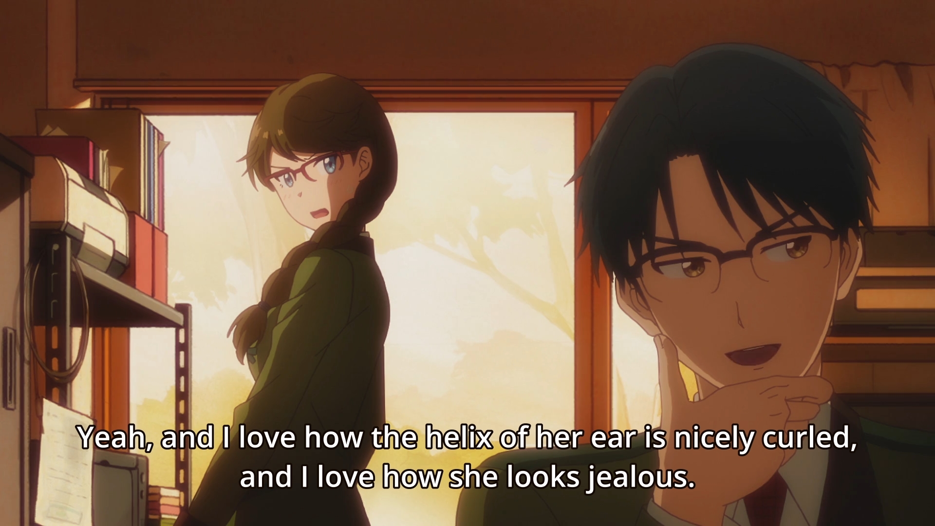We briefly take a break from Tada and Teresa to focus on another hapless couple: Hajime and Hinako. She loves him, and he loves her… but he doesn’t really love her. He loves HINA, her alter-ego. And I know, I know… HINA is just one facet of Hinako, so you could argue that he loves Hinako as well. You could argue that, but I’m not convinced. When Hinako tells Hajime to write down what he likes about HINA, he goes on and on about her appearance. He loves her breasts, the way she pats her hair, the Girdle of Venus on her palms, the shape of her ear, so on and so forth. And look, it’s fine to adore someone’s looks, because physical attraction is important too. But it can’t be the only thing you care about. Not once does he say anything about HINA’s personality. Not once does he say something like “Oh, I love her confidence” or “I love the way she meets life head-on!”