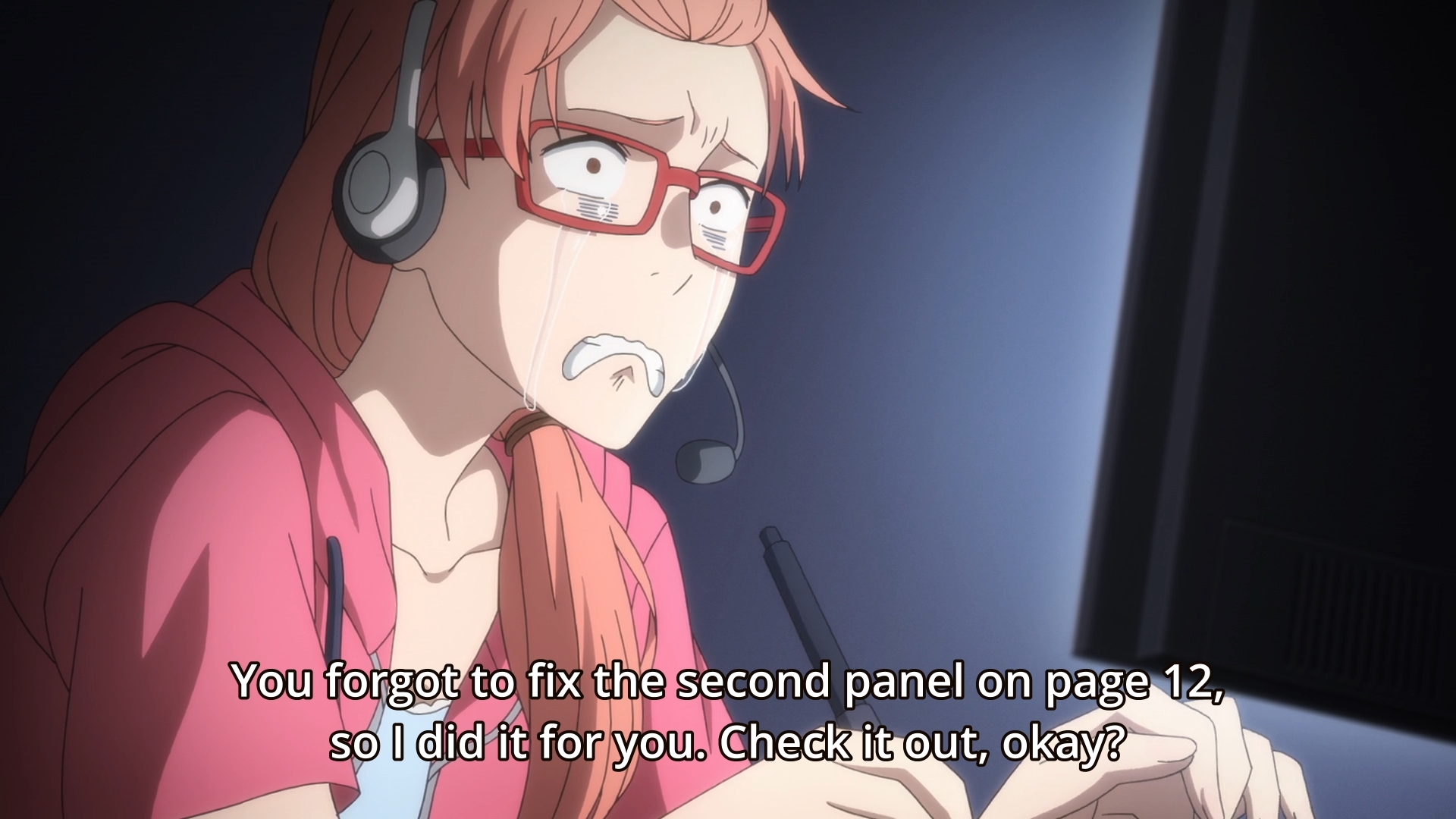 — The major theme this week is that Narumi has priorities in her life — priorities that easily come before Hirotaka. Maybe he’ll become one of her priorities one day, but not now. Not yet. There’s a big dojinshi event coming up, and she’s nowhere close to finishing her contribution. Does Hirotaka mind? Of course not. It sounds like he’s been in love with her since childhood, so he can stand to be a little more patient. In fact, he even helps her out with her doujin. Who knew he could also draw? He also has to remind her to sleep.