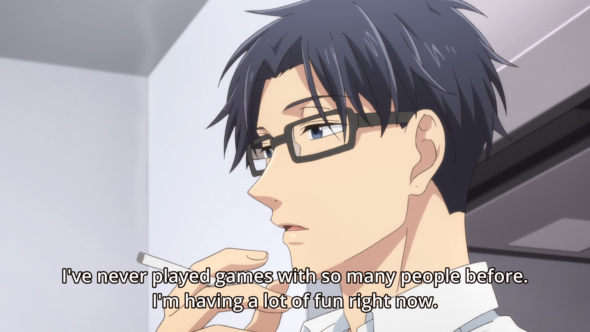 — All of a sudden, Taro and Hanako show up for a “sleepover.” I didn’t know adults did sleepovers. Also, Hirotaka thinks he told Narumi that he had invited their friends, but I don’t think he did. Narumi is initially annoyed, but she relents when she sees how “happy” he looks to have so many friends at his place at the same time. Gosh.