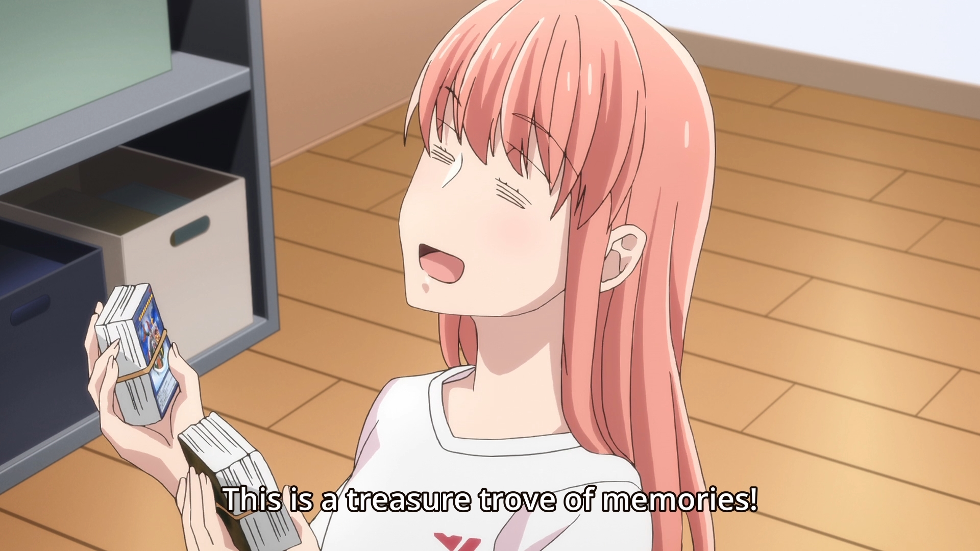 — She spots an indistinct blue box, so she starts digging through it. Before I go on, I also gotta add that it’s a little odd for Hirotaka’s friends to just rummage through his stuff. I know he technically gave them permission, but still… I’d never violate someone’s privacy like that. I used to have girlfriends who wanted to share passwords for everything — emails, social media, chat clients, you name it. I always found that weird. Don’t you guys like having your own personal space? But I digress. The girl finds a bunch of old trading cards in the box.