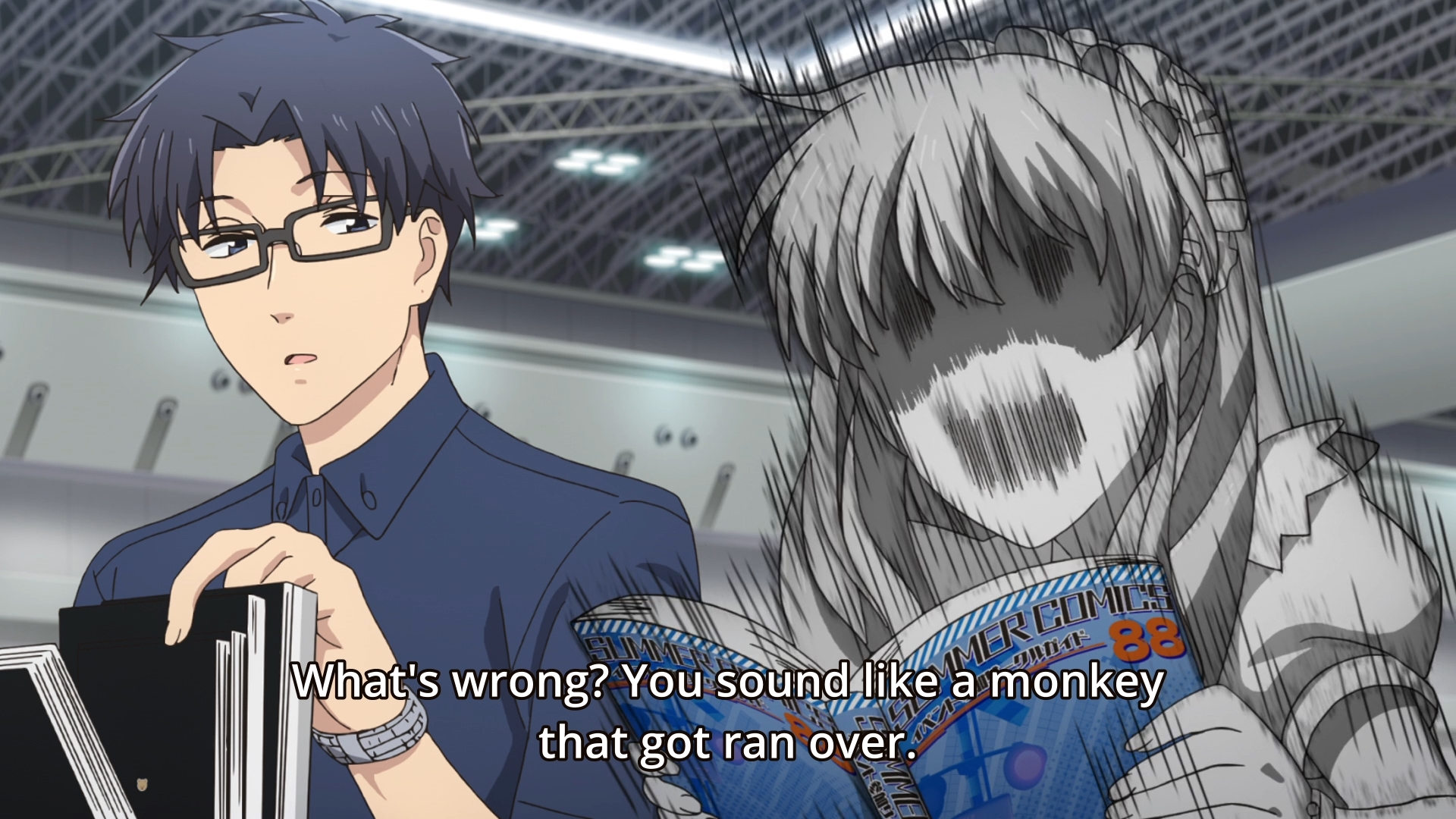 — The big day arrives, and Narumi is busy schmoozing with her fans. Hirotaka remains patient. When the girl fawns over one of her favorite artists, he actually gets jealous. But he keeps it to himself. Still, would Narumi ever fawn over him like that one day? There’s so little chemistry between them that I can hardly see it. Maybe that’s the point. Maybe dating for otakus just doesn’t come naturally or something. Still, a little communication would be nice. Telling her that he’d like some attention from time to time would be nice.