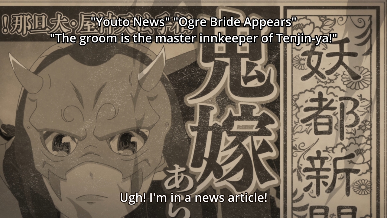 — The girl quickly learns that she’s infamous, but not for the right reason. A recent newspaper has let it be known that she and Odanna will soon get hitched. Yo, what about the soon-to-open restaurant? You might want people to know about that as well. But like usual, Aoi’s not remotely perturbed; she looks mildly annoyed at best. Aoi’s biggest weakness is that she’s as careless as her late grandfather. He, however, was blessed with a weird ability to beat ayakashi up with just his bare fists. Our heroine can’t make the same bold claim.