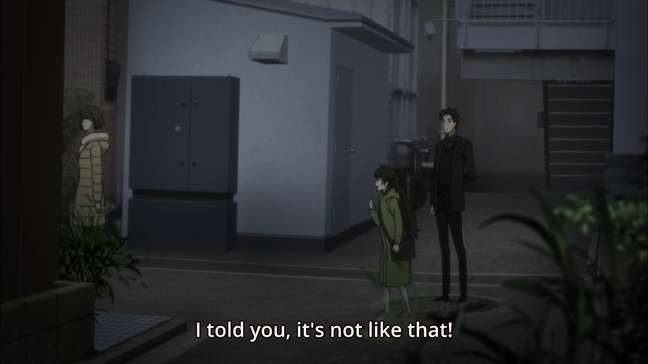 — Rintaro can’t trust the woman, but then he doesn’t protest when Daru decides to hire her. Ah, anime characters and their lack of communication. He doesn’t have to outright make a scene, but he could at least suggest to Daru that they should talk it over first.