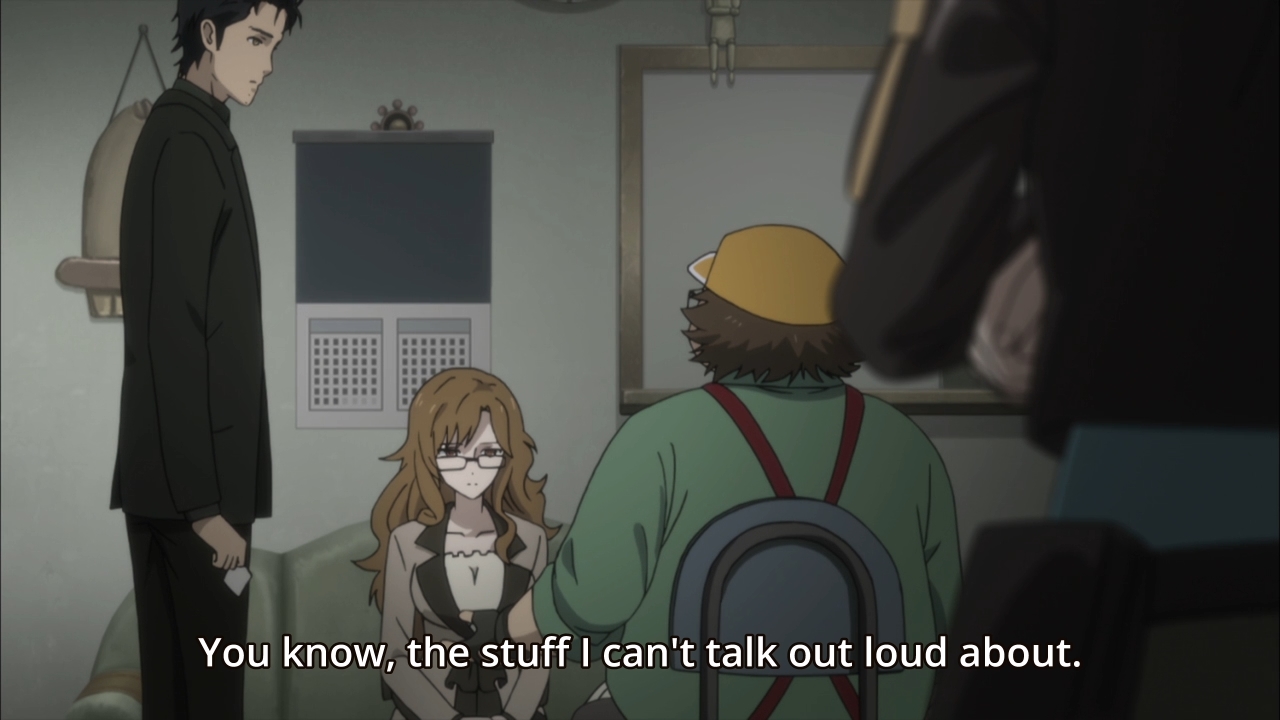 — Does nobody notice Rintaro freaking out about Moeka? Or is it one of those anime things where his inner mental state is visibly only to the audience? At least Suzuha asks him about it later. Daru seems oblivious, though.