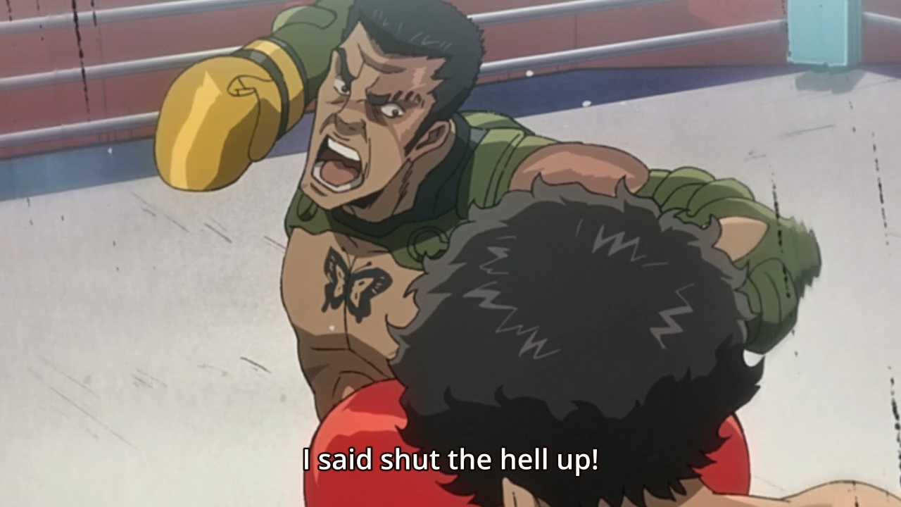 — Joe grabs onto Aragaki to slow the fight down. This is clinching, and it’s a legitimate survival strategy. Every boxer clinches, but people seem to think that Mayweather is the biggest offender. Viewers can get as mad as they want about how clinching is boring to watch, but if your goal is to win at all costs (and make it into Megalonia), then you gotta do what you gotta do. Plus, it all depends on what the refs will allow. Some refs will break it up quickly. Some won’t. The audience should really get mad at the refs instead.