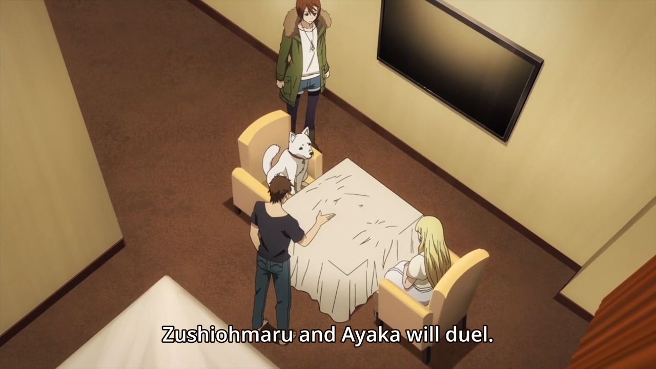 — And even more unfortunately, Yuuga gets to decide what game they’re playing. As a result, Poochy has to duel Ayaka in an eating contest where the only “food” in front of them are stainless steel utensils. The guy is a fucking rat bastard, and naturally, things will get worse from here on out. Again, I’d walk away, but Eia is too attached to Poochy. As a result, Poochy loses the duel, and Eia has to stick around to make sure her dog is safe. Dumb.