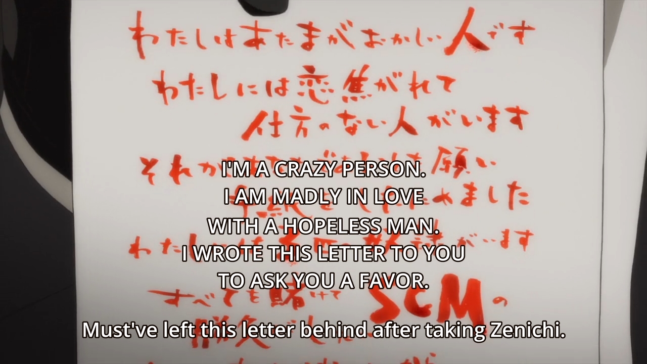 — Unfortunately, Julia shows up with some bad news: someone stole Zenichi. Like… what? Just waltz in there and dragged the guy out of his hospital room? All that was left behind is this fancy red envelope.