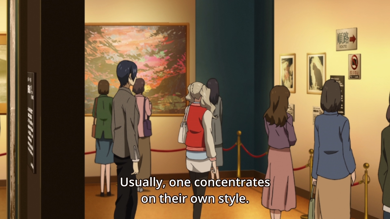 — Plus, it never made sense to me how he got away with stealing his pupils’ works. Everyone has their own style, so it would’ve been blatantly obvious that Madarame’s works seem to vary wildly in not just vision but technique as well. There should be no consistency to his oeuvre. The characters even point this fact out, and yet, you want to tell me that art connoisseurs in general have no clue that this old man is a fraud? C’mon. Sure, the story tries to hand wave this away later on with a certain painting that gets copied and sold to everyone, but that alone raises a whole bunch of new issues. For instance, don’t these rich people talk? Wouldn’t they brag to each other that they just bought Madarame’s most famous painting? How would that sort of news not spread like wild fire? And once it did spread like wild fire, how would these people not raise a stink about the fact that they all seem to have the same shitty painting?