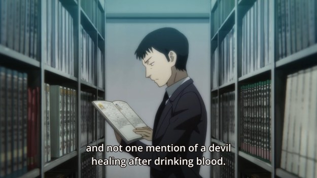 — Okay, rant over. Sawazaki learns that the healing effect of drinking human blood has been suppressed by the government for whatever reason. Or, at the very least, no one seems to know anything about it, but that’s unlikely.