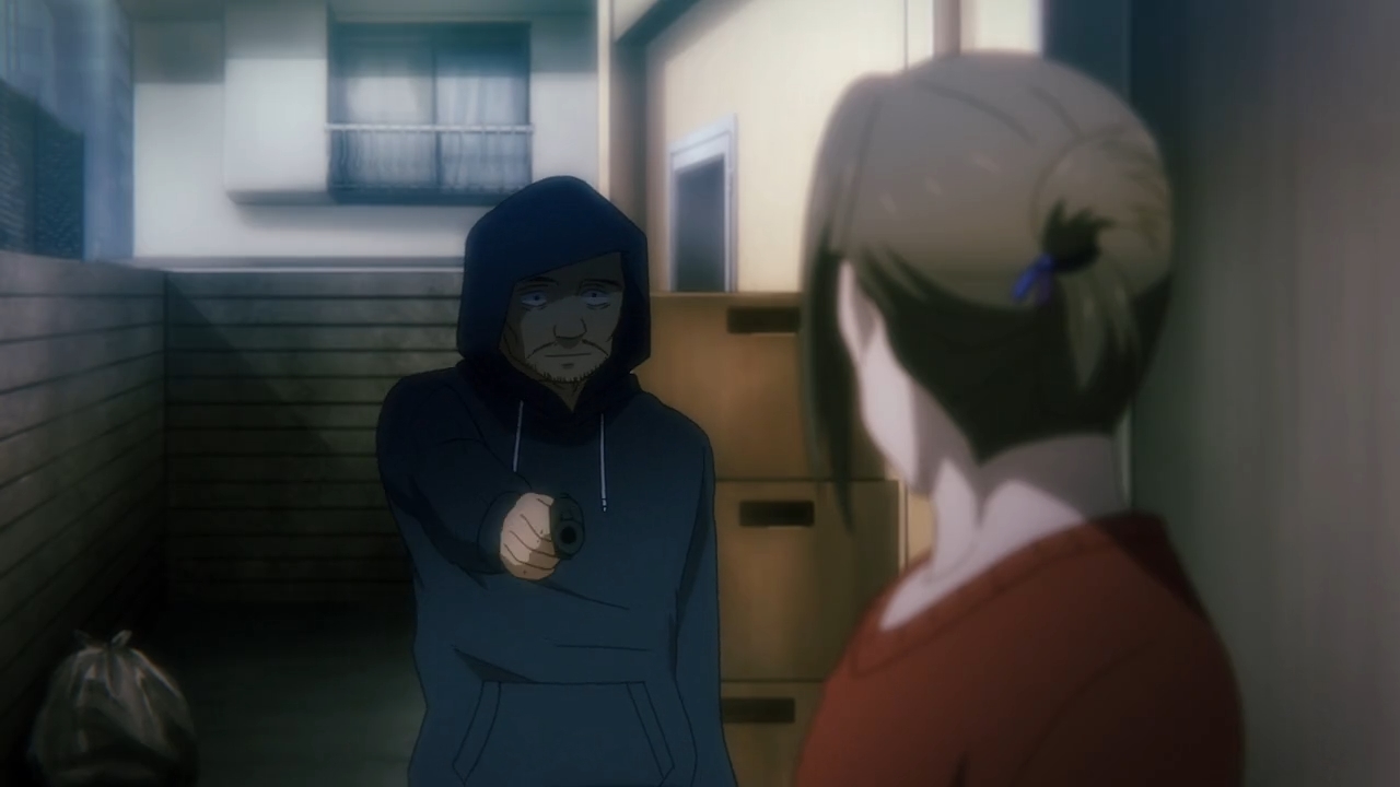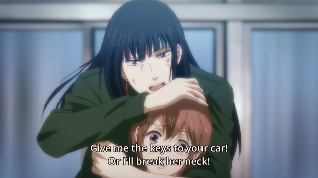 — Tsukasa insists on taking Oryo to the hospital for some reason. Like, I don’t even know why she thinks she can help. She’s just a college student studying… literature, I think? What did she hope to do? Offer moral support? ‘Cause she can’t protect anyone. She’s not a doctor either, so she can’t help keep the guy alive. Either way, when she and the rest of the gang arrive at the hospital, Tenjo is in the middle of escaping. The latter immediately grabs our heroine and takes her hostage. Good job, girl! You just had to come, didn’t you? But of course she did. The story needed a convenient way to endanger her, so she made some silly decision to accompany Oryo.