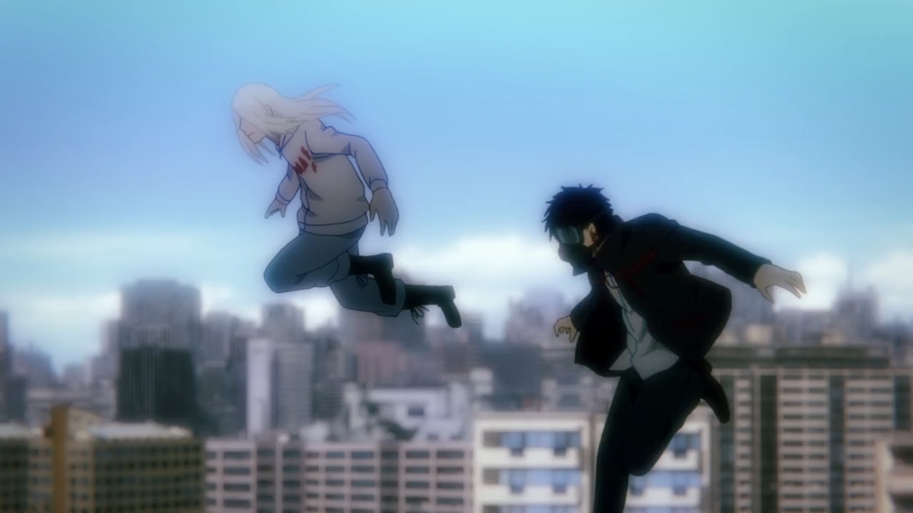 — We shift focus again. Remember Oryo, the friendly vampire that Tsukasa had bumped into? He unluckily saw Kikuhara shove that kid off the building, so now the bad guys are after him. I think the hooded fellow is Zero Four. Sawazaki arrives just in time to prevent Oryo from being killed (how the hell did Zero Four miss at such a short distance?), but this soon turns into a chase. The guy behind Sawazaki is Makimura.