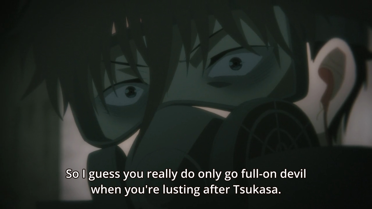 — Meanwhile, Tsukasa doesn’t say a word in protest. She just looks sad off to the side. One thing I really dislike about her is how she coddles Anzai. She never gets mad at him about anything. He randomly stalks her, and she doesn’t mind. He randomly shows up at her apartment window, and she ends up falling in love with him! And now, he’s being a dick to her friend, and it’s still copacetic for the most part. She treats Anzai like he’s just this misunderstood child who needs an infinitely long leash. No, he’s a grown adult. Yes, when he fully goes ugly vampire, he can’t control himself. But that has only happened once. Right now, he’s still in full control of his faculties, and he’s decided to use them to be a dick. Say something! If you want to be his partner, you have to be willing to tell him off when he’s being a jackass!