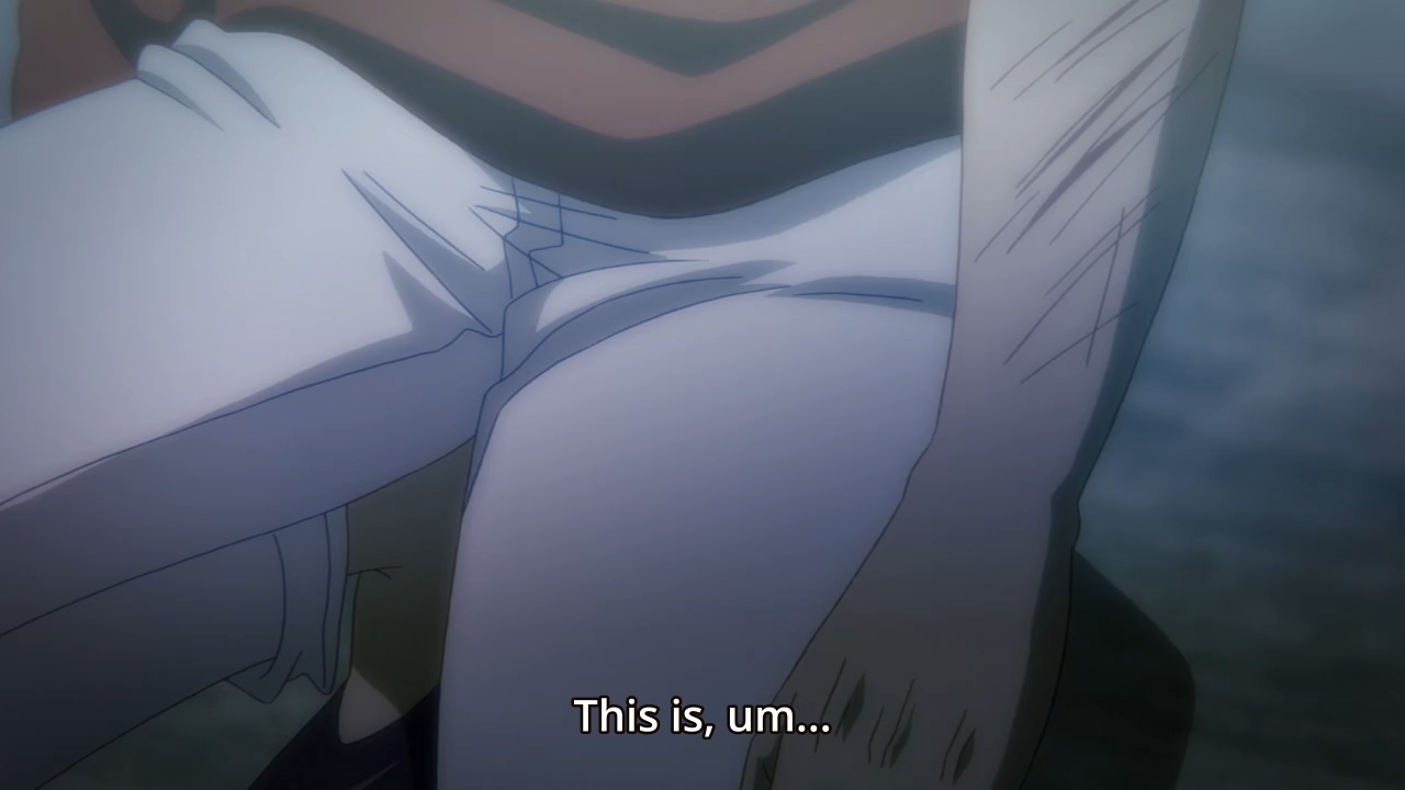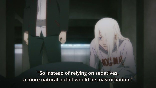 — Lee is the first to show up, and he immediately punches Zero Four in the nose. Unfortunately, this draws blood so maybe he should’ve socked the guy in the stomach instead. He tries to distract Anzai from going nuts by dehumanizing Zero Four and calling him Ketchup. Okay then. What’s more interesting, however, is Lee’s proposed solution to Anzai’s bloodlust: masturbation. After all, he only truly loses his shit around Tsukasa, right? This shouldn’t come as a shock to either our hero or the audience, though. After all, we’ve already seen him masturbate to Tsukasa’s blood. Remember when she cut herself in an attempt to fight off the rapey professor, and some of that blood got on one of Anzai’s hands. Yeah.