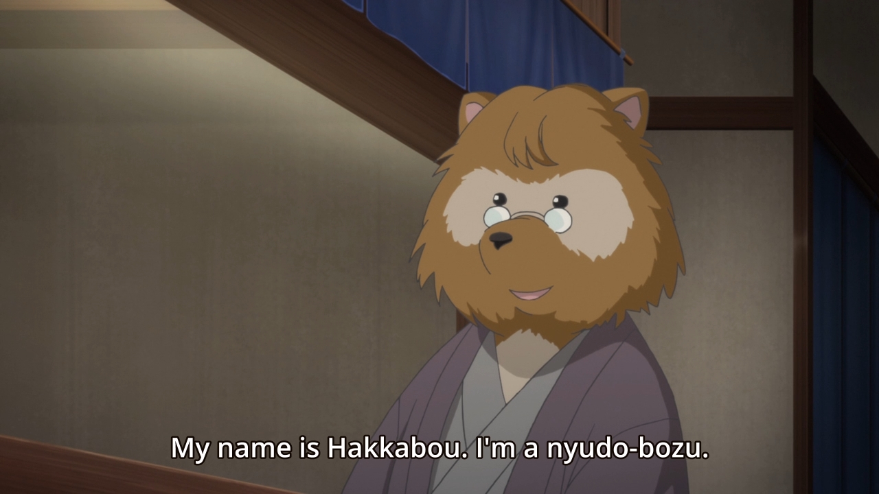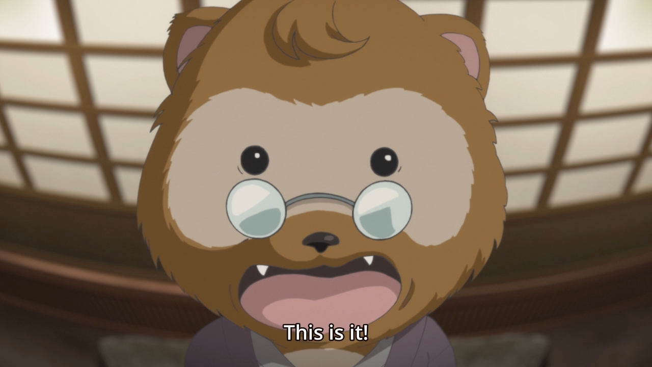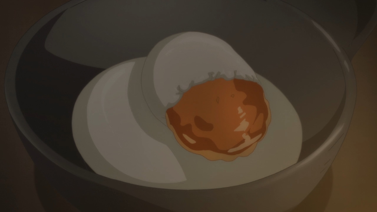 — So the writer is a tanuki, and he would like to try more of Aoi’s food, so she serves him a dish that includes one of those onsen eggs. It looks kinda uninspired, but this whole anime is rather uninspired.
