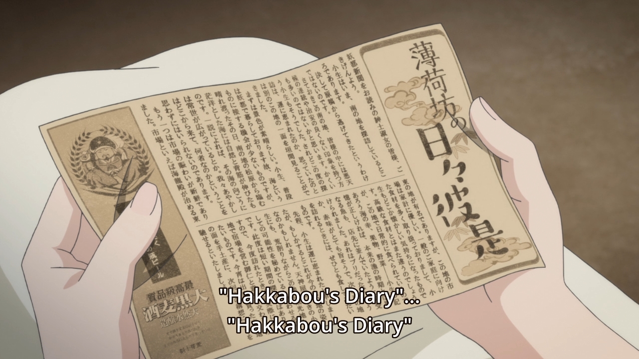 — So Aoi is stuck with having to save her dying business, but she doesn’t have to wait long before the first stroke of good luck hits her right in the face. Apparently, a writer has been staying at the inn, but he’s struggling to finish his work. Because he’s struggling to finish his work, he’s not eating any of his meals. But because he’s not eating his meals, it becomes increasingly hard for him to focus on his work. Ahhh, how terrible! So Oryo suggests that Aoi whip up a week’s worth of bentos. Easy to eat bentos, to be exact. Why should Aoi lend a hand? Well, the writer also happens to publish his works in the local newspaper. Eh? Ehhhh? How ’bout that advertising that I’ve been harping about for several posts now?