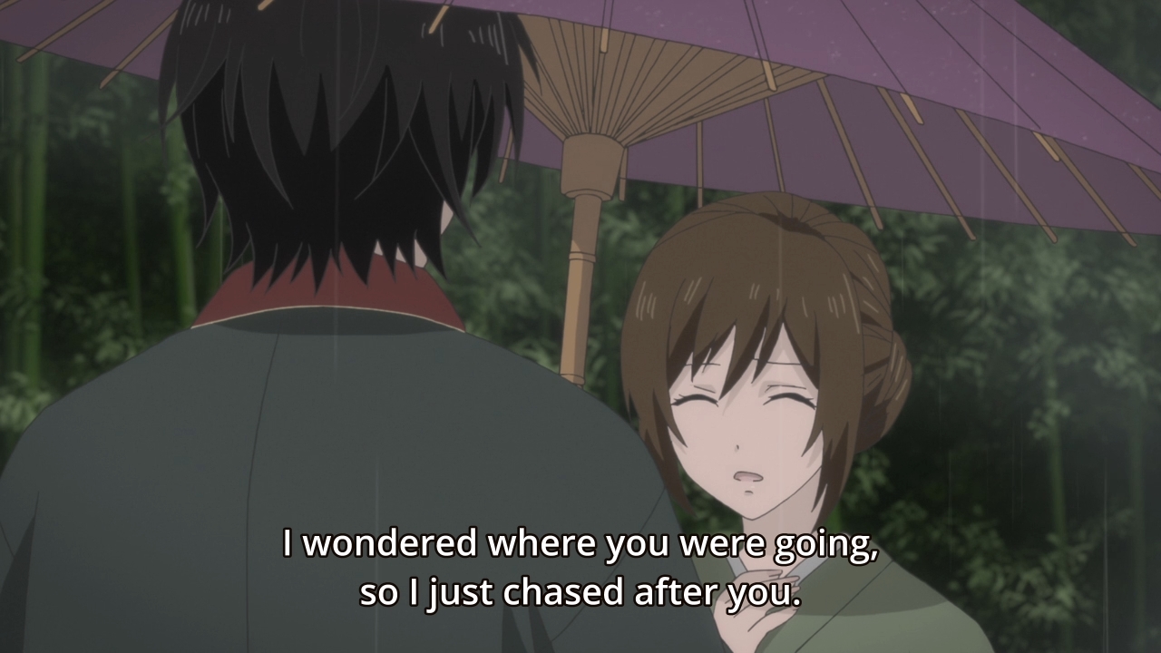 — But before Aoi can come up with a suitable bento for a busy writer, she gets distracted by Odanna sauntering through the rain. She decides to join him, because… just because, I guess.
