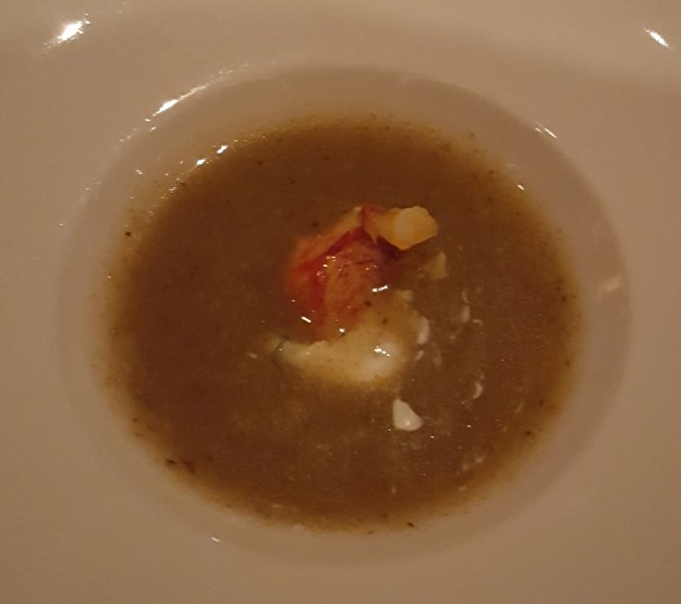 But before the actual courses came out — before the waiter even took our order — the kitchen gave us this pathetic soup. I hate, hate, hate lukewarm soup. To make matters worse, it had absolutely no flavor. It was just this watery, slightly meat-tasting soup with a tiny piece of lobster. The white stuff you can barely see in the soup? It’s probably supposed to be creme fraiche. Everything about this amuse bouche was just sad.