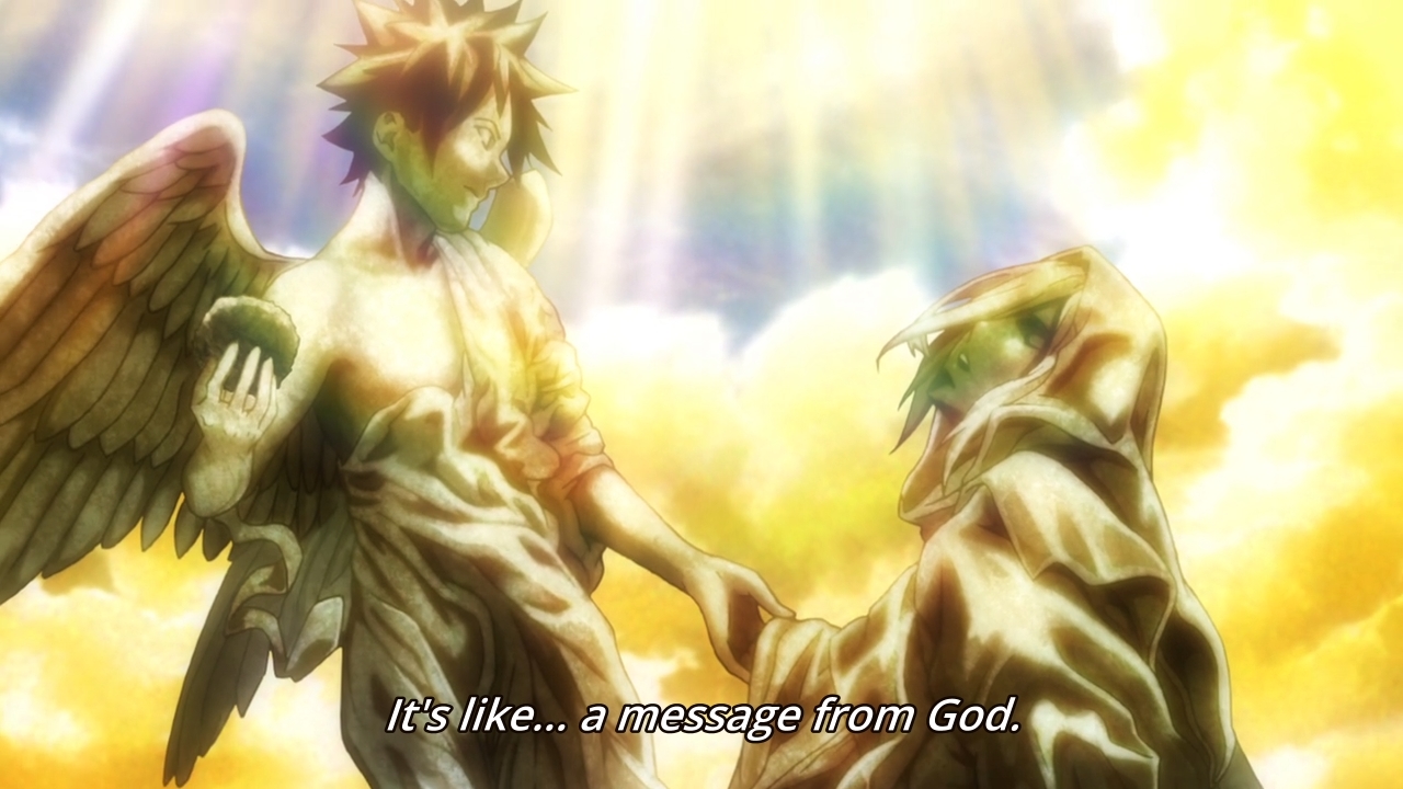 Akira wants to know what drove Yukihira to try so hard, and our hero claims it was all for his buddy. The former then tries his rival’s dish, and of course, he has a food orgasm over it. In fact, he feels as though he’s been visited by God. That’s a bit much, don’t you think? But it’s not all fun and games, because Jun quickly shows up to slap the guy across the face. Then she tearfully confesses that she doesn’t care about her research if it meant depriving Akira of his joy in cooking. Aw… too bad I don’t really care about either of these two characters.