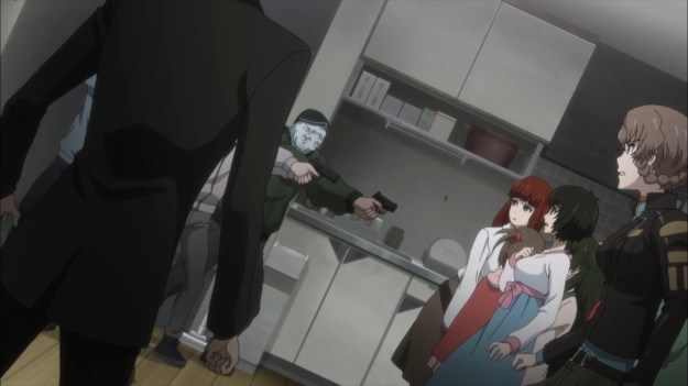 — The program abruptly closes itself (crashes?) as soon as Amadeus brings up Rintaro. Maho examines the phone, but finds nothing wrong with it. She can’t connect to the server powering the AI, though. All of a sudden, ominous music kicks in, and Mayuri notices that her watch has stopped working as well. Rintaro starts to freak out, and well, you know what time it is! It’s time for our cliffhanger of the week! Masked intruders storm the apartment with guns, and predictably, the episode comes to an end.