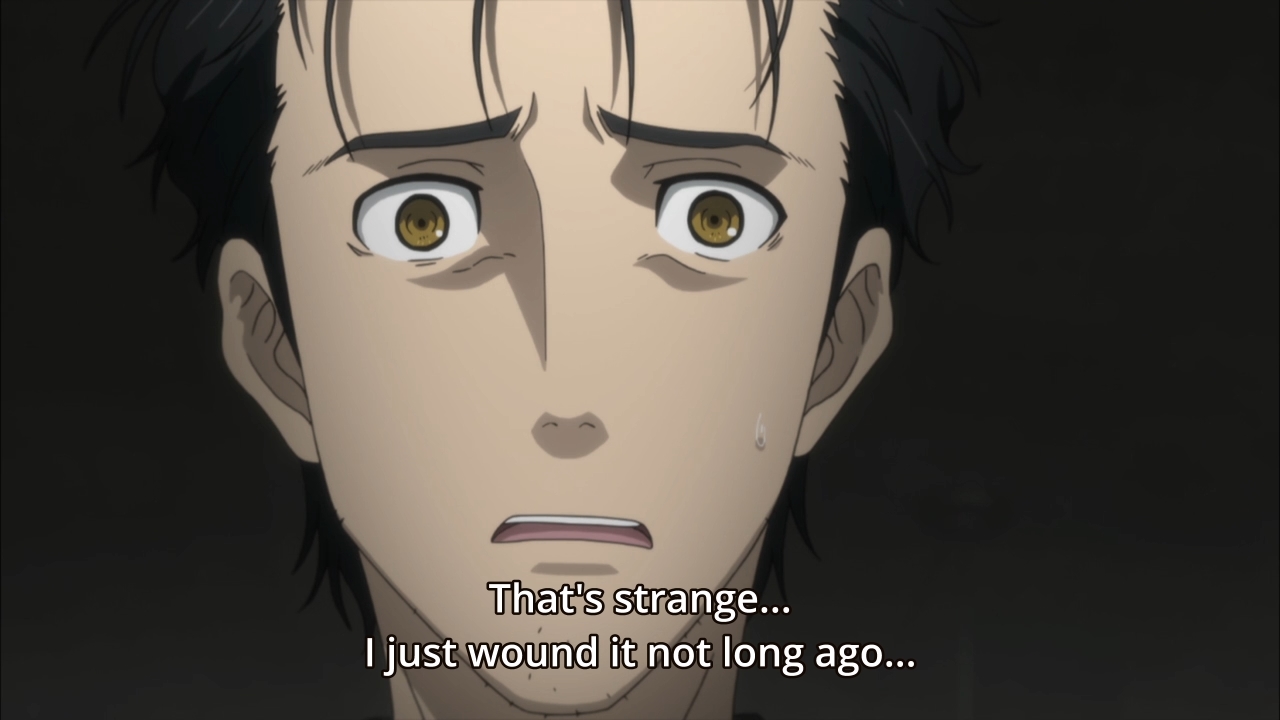 — Oh great, these two schmucks are here. Just about five or six minutes left in the episode though (you have to account for the ED), so I’m sure the story’s about to drop some bombshell on us. At the very least, it’s going to try and end on a cliffhanger. Judging by the last few episodes, Steins;Gate 0 appears to be obsessed with this storytelling gimmick.