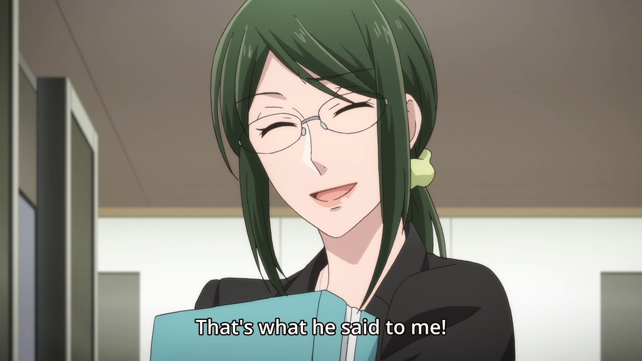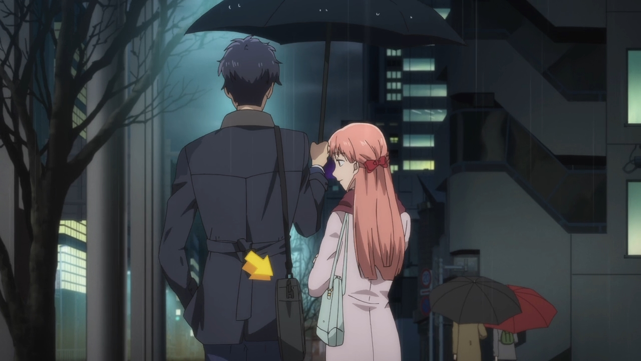 — Later that night, we see Hanako trying to leave the office alone, because it looks like Taro will be working late again. But it turns out he actually made dinner reservations at a swanky place overlooking the city. Eh.