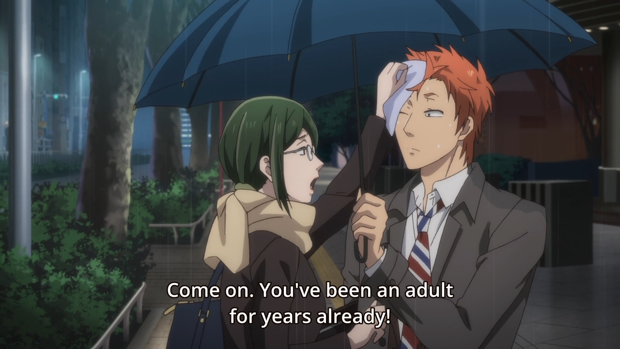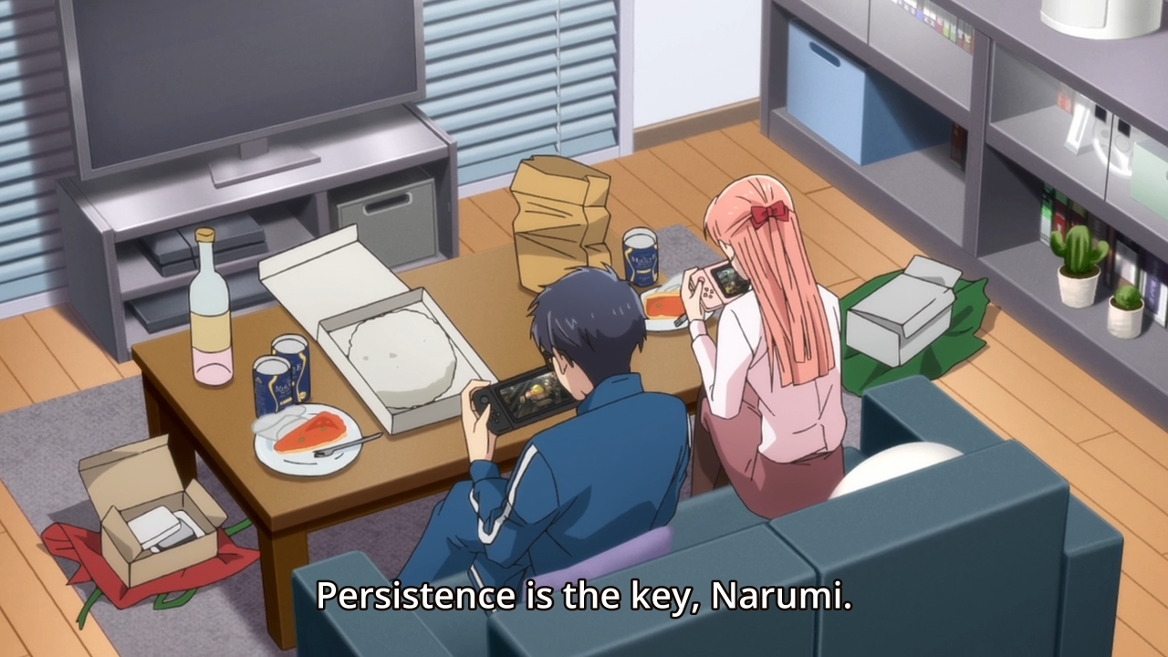 — Hirotaka tries to invite Narumi out later that night, but she’s very hesitant. Knowing this show, though, what’s troubling Narumi is probably something stupid, i.e. something related to her otaku interests. Nevertheless, she keeps insisting that everything is fine. She, however, accidentally lets it slip that it has nothing to do with Hirotaka. So something is bothering her. Man, I can really feel the love from here. If you can’t depend on your boyfriend for emotional support, then why even have one? Man or woman, we always want to feel as though we’re needed. When our SOs try to shoulder their own burdens by themselves, it doesn’t make us feel any better. For an adult, she has a lot to learn about adult relationships.