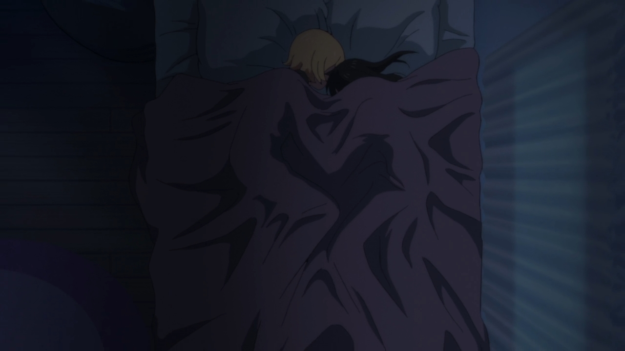 — Afterwards, Tsuyuno and Aya share a conversation in bed. It sounds like we have a beach episode coming up, ’cause that makes sense. Gee, we got middle school girls murdering each other, but what if they did it in their bathing suits?