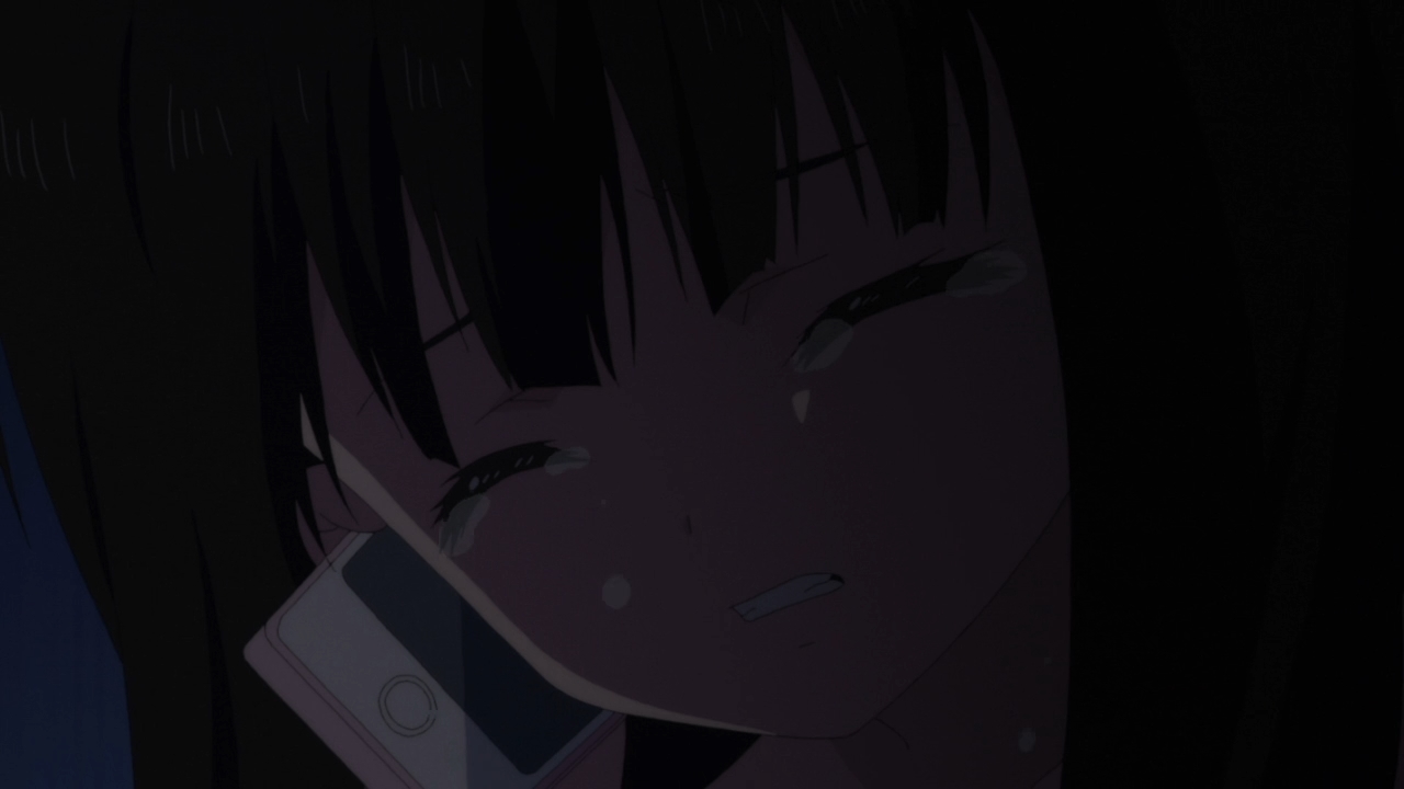 — Unfortunately, the fun is short-lived, because you’re watching Mahou Shoujo Site. Kosame calls Aya up to deliver some bad news, but the viewers don’t get to hear said bad news. All we get to see is Aya falling to her knees and crying. Ugh. This storytelling sucks ass.
