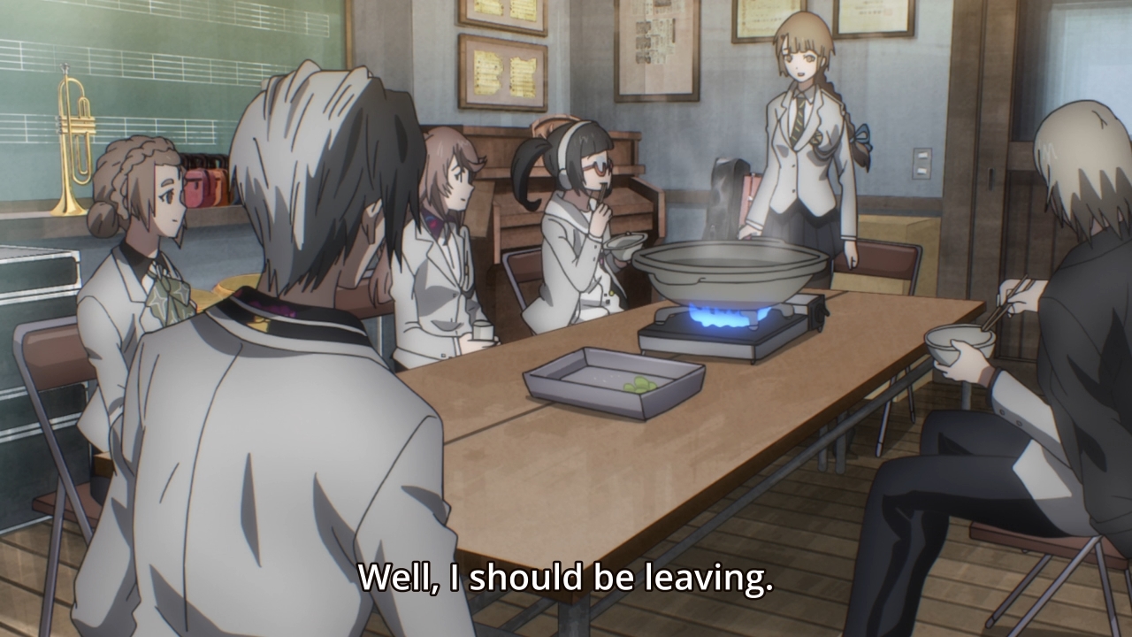 — Shogo tries to break up the hot pot circlejerk to talk about all-important plot information, but no, we can’t have that. Our attention boomerangs right back to the hot pot when Aria freaks out at Suzuna dumping udon noodles into the simmering pot. Sigh.