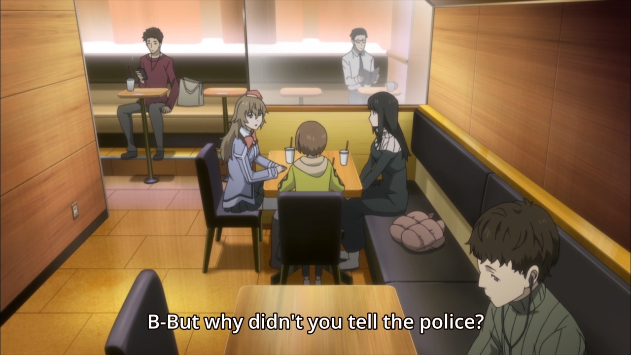 — Afterwards, everyone just goes their separate ways without alerting the authorities. Rintaro and Suzuha probably know that this wouldn’t help, but the others don’t. They just know that someone just tried to kidnap Kagari. Wouldn’t their natural reaction be to tell the police and seek out help and/or protection? There’s no reason for Kagari to think that those masked men wouldn’t try to kidnap her again.