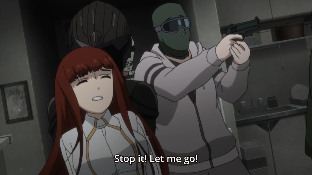 — You’d think that after everything Rintaro’s been through, he’d install some security cameras around the lab. It wouldn’t prevent these masked men from storming the place, but a little warning never hurts.
