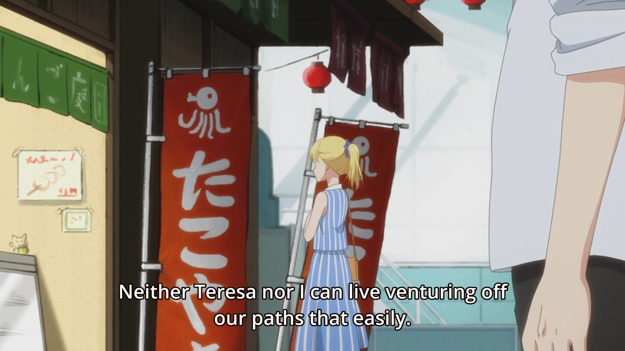 — As for Teresa, any reminder that she has to leave by the end of the year only seems to push the girl even closer to Mitsuyoshi’s emotionless backside. God, look at that man’s broad shoulders devoid of any joy!