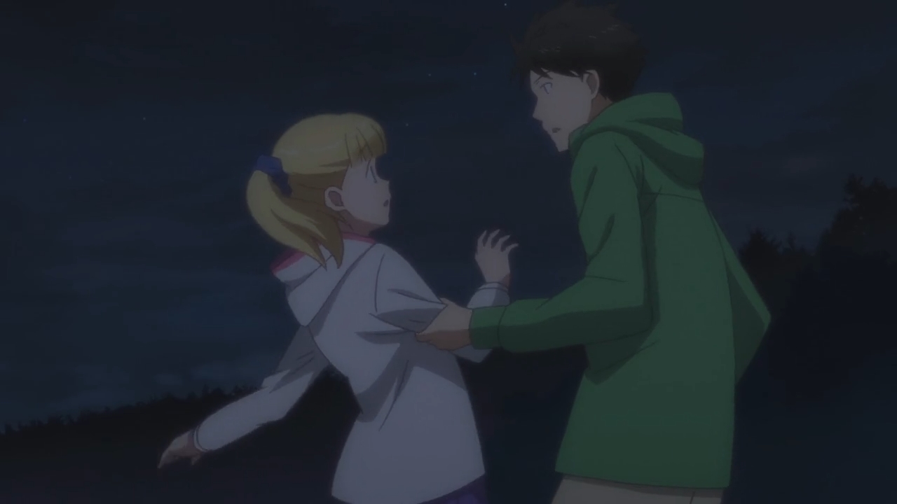 — Unfortunately, it’s currently cloudy out, so the kids are worried that the weather won’t clear up when nighttime rolls around. But look on the bright side: every time it rains, Mitsuyoshi always gets to share a tender moment with Teresa.