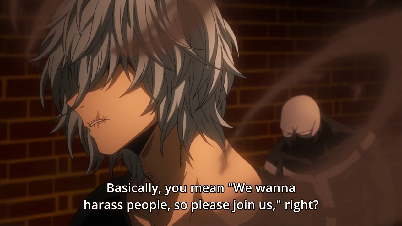 — We cut to Shigaraki giving Bakugo a spiel about how being a hero makes no sense, but eh… where’s the passion? I can’t help but think that the guy isn’t really putting his best foot forward. In fact, it feels like a bunch of bad guys think they can flip a hero by just talking it out, and that doesn’t strike me as very villainy. I think what this show lacks is an antagonist that is truly awe-inspiring in how much they can make you hate them. I don’t like Shigaraki, but he’s just kinda… lame. As an antagonist, he’s limp and kinda pathetic. Griffith, on the other hand… hoo boy, now that was a man to hate.