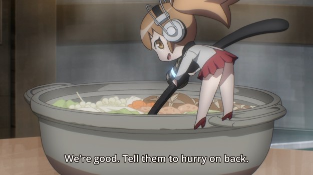 — Ike-P breaks down and cries, but his opponent just walks away. After all, he needs to get meatballs… for that hot pot. Sigh. The bad guy could’ve kept fighting, but nah. He leaves to reunite with the rest of the Musicians as they await Mu’s awakening. With her back in the fold, I guess they can finally take it to the Go Home Club. Without her, all they can do is sit on their asses for an entire month and twiddle their thumbs. I’m glad we devoted an entire episode to establish that very fact.