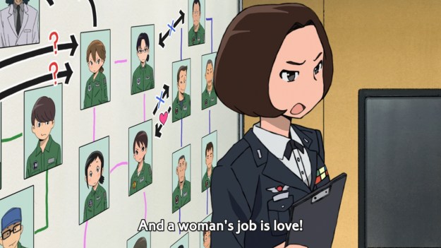 Apparently, something big is supposed to happen once these poor girls become emotionally dependent upon their OTFs. Yeah, it’s as bad as it sounds. Iiboshi’s latest scheme is to crush the D-Pilots’ hearts. For instance, Haruto is instructed to make Hisone fall in love with him, then reject her completely. The idea here is that the resulting heartbreak will make the girl give up on love, thereby tying her heart even closer to Masotan. That’s hilariously unethical, but supposedly, the future of the nation depends on the success of the Ritual… whatever it is. I doubt Haruto can pull this off. He’s not that heartless… but we’ll see. One big problem is that Haruto might end up falling in love with Hisone, so it makes even less sense for him to hurt her. Plus, Hisone is one of those typical clueless anime characters. You know what I’m talking about. These characters are so blissfully unaware of matters concerning the heart that you can’t even imagine them falling in love. A guy asks Hisone out to the movies, and not once does she think, “Gee, I wonder why he wants to hang out with me.”