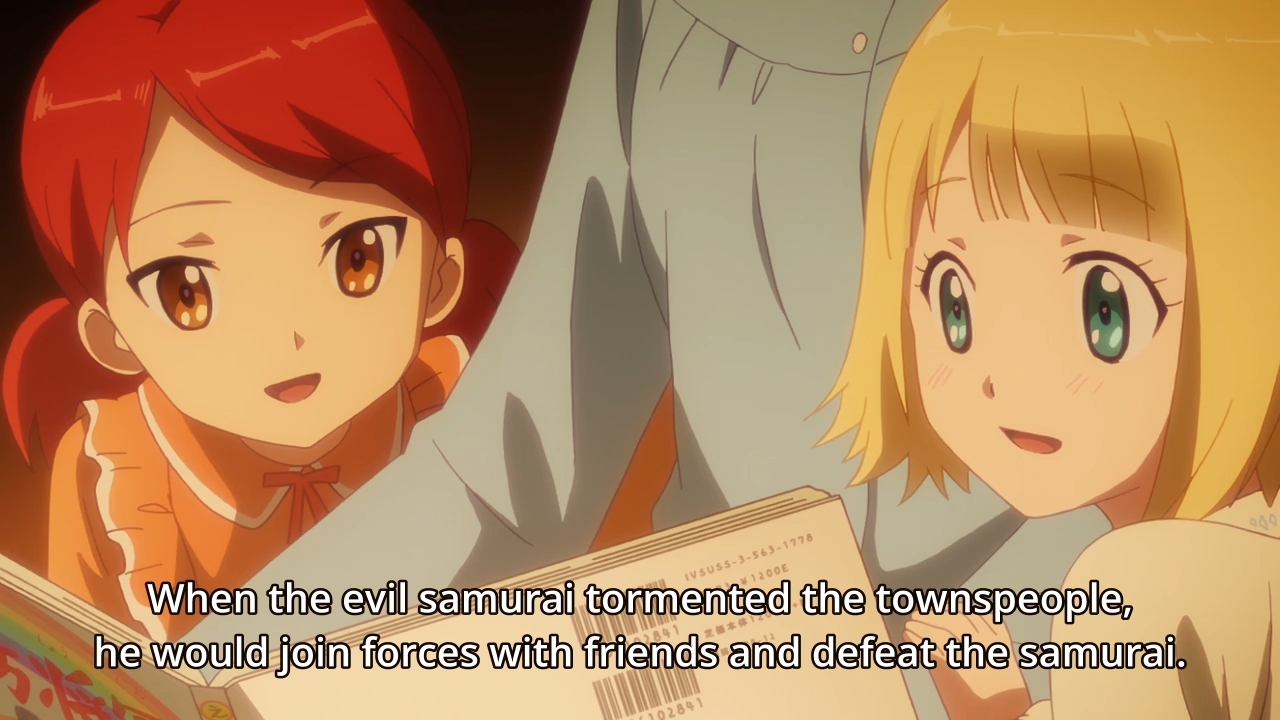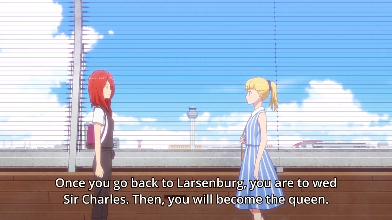 — After the OP, we see a flashback scene where both Teresa and Alec are young children. A woman is reading a Rainbow Shogun storybook to them. Naturally, Teresa has always wanted to grow up to be like the Rainbow Shogun. Alec, on the on the other hand, has always wanted to grow up to be a ninja… a ninja that protects her queen. This seems like such an innocent scene, but it says a lot about the red-haired girl. Her desire to see Teresa become queen is just as much about her as it is about her friend. Alec sees herself as Teresa’s bodyguard forever and ever. This is her dream, and although she might not come out and directly admit it, she selfishly doesn’t want anything to potentially ruin her ideal future. As a result, she’s way too protective of a teenage girl who obviously wants to spread her wings and live her own life.