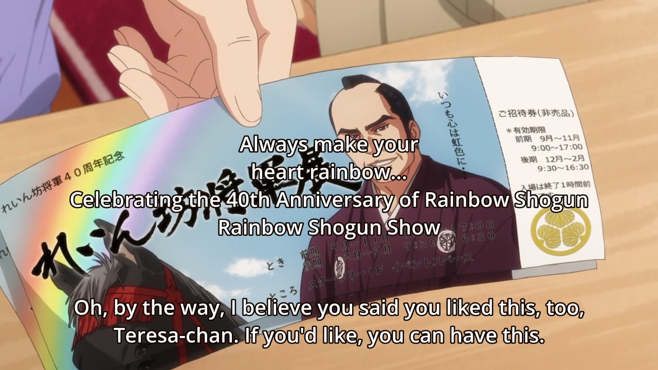 — As for Teresa, a nice, old couple hands her two tickets to a fancy Rainbow Shogun show. Obviously, she and Mitsuyoshi have future date to schedule.
