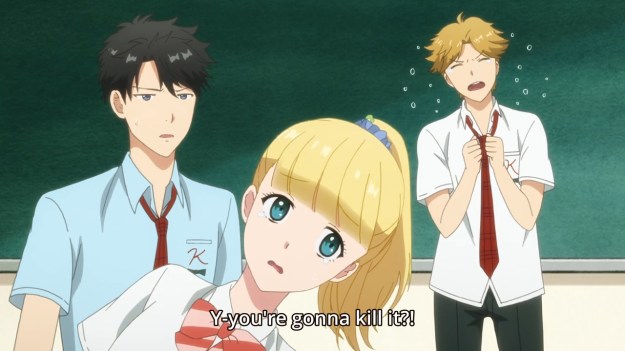 — This next part is dumb, though. In class, Mitsuyoshi spots a caterpillar crawling on Teresa’s head. When he brings her attention to it, the girl freaks out. I assume she’s scared of creepy crawlies or whatever. She asks Alec to help her out, but her best friend seems to have an issue with bugs as well. Guys, it’s just a caterpillar. In the end, Mitsuyoshi gets to look like a hero when he goes and gets rid of the caterpillar for her. The entire class even gives him an ovation. Am I on drugs or something? It’s just a fucking caterpillar.