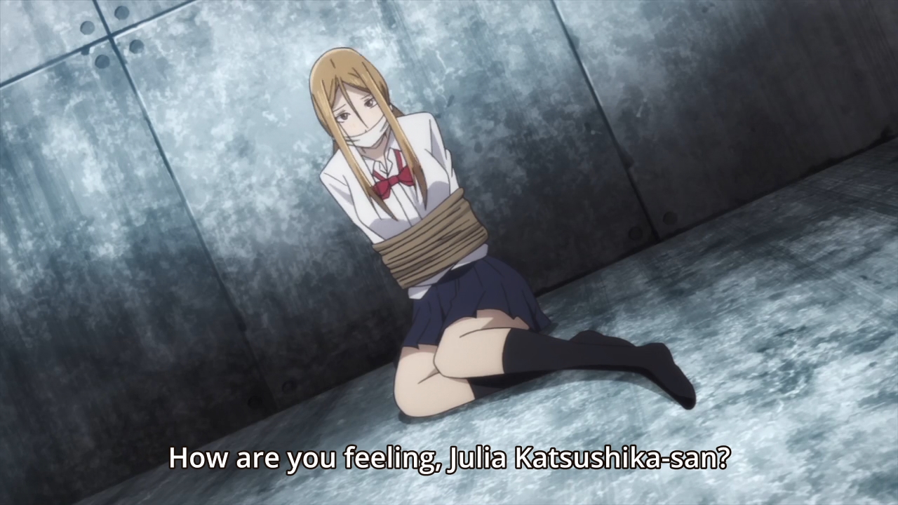 — When Julia wakes up, she finds herself tied up in some metallic room. God only knows where these characters always manage to find such empty dungeons in the middle of modern Japan.