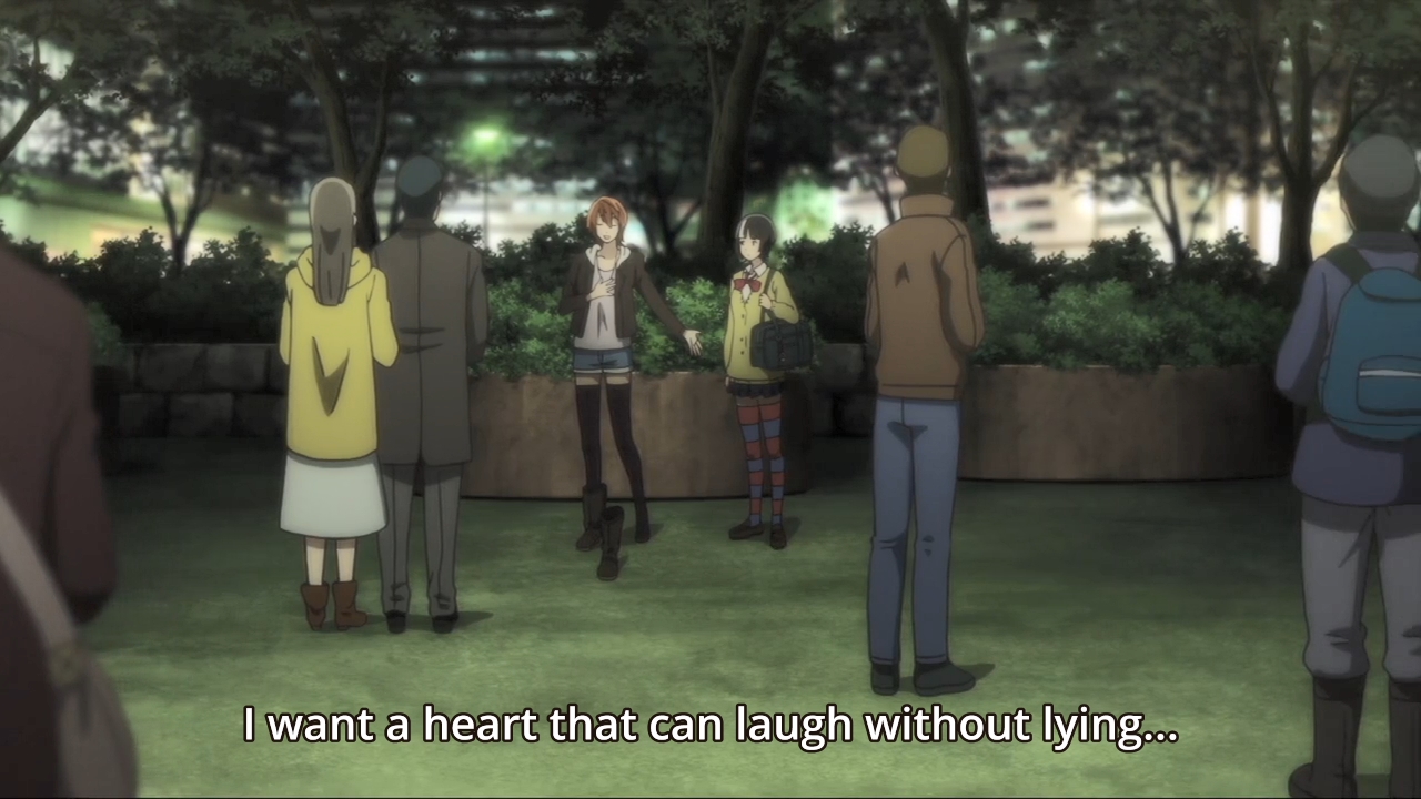 — Mustachio quickly tells his henchmen to collect money from all the nearby businesses. He then puts on an earpiece so that he can listen in on Eia. Our girl has gone to a park to sing for money. She’s not just singing any random song, though. She’s singing the OP! I rolled my eyes so hard at this moment.