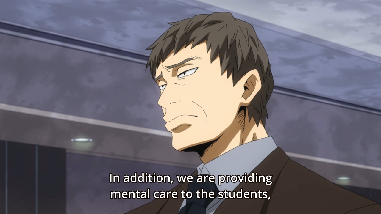 — I dunno if it’s the subs or if Aizawa just doesn’t want to be combative, but I feel like he’s not defending himself as much as he could. For instance, when the reporter asked him why he urged the students to fight, I thought he should have corrected the reporter’s wording. He urged the students to defend themselves. Why not make that clear?
