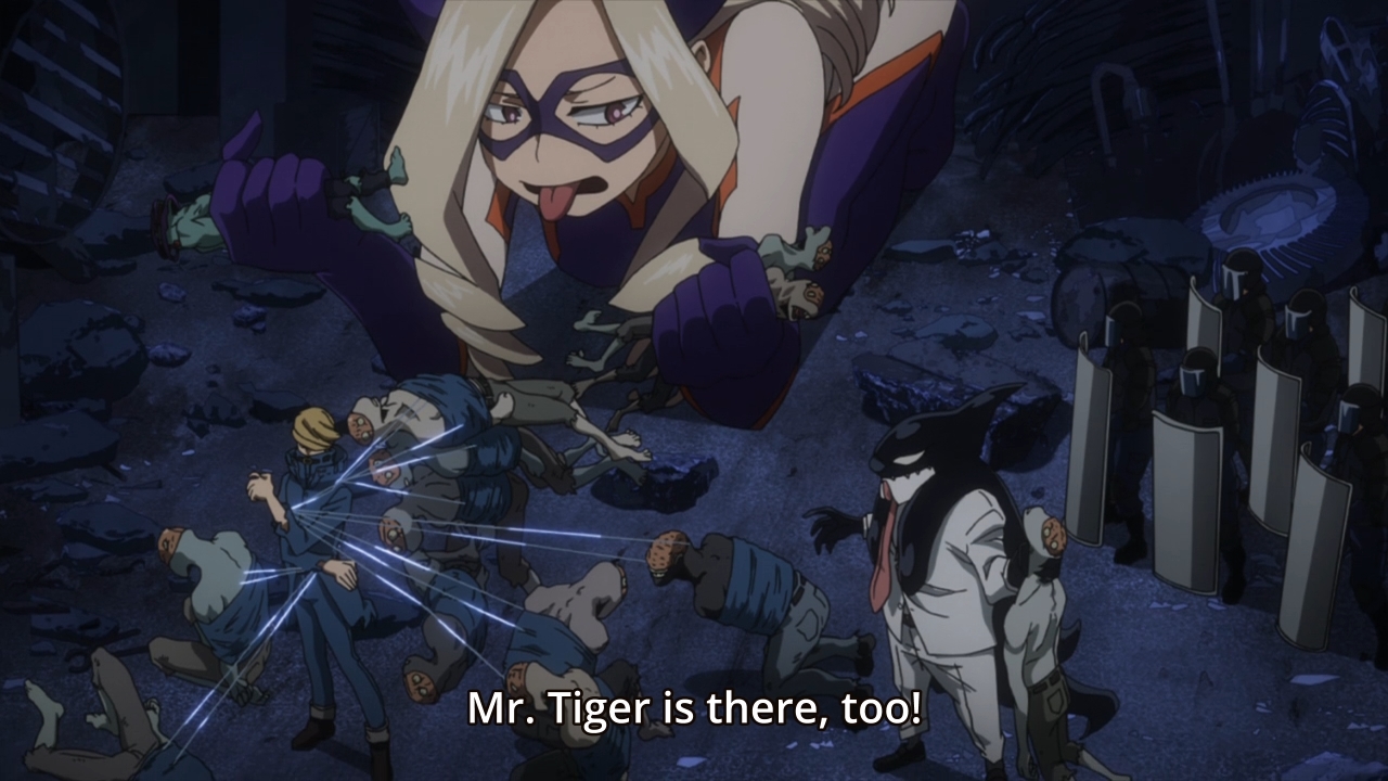 — So we get to see what happened two minutes ago. Mt. Lady sticks her tongue out at these Nomus. I find it amusing. Her colleagues are all trying to be professionals, but she’s just straight up disgusted.