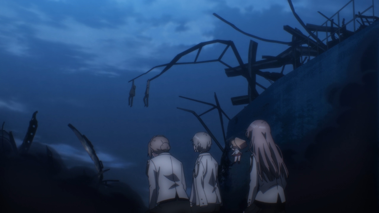 — The entire group minus Ritsu just end up walking home dejectedly. But speaking of Ritsu, we see him doing some shady shit to that door we just left. So… is he the antagonist now?! I heard something about how the PS4 remake added the option to betray his friends. It would be interesting if the anime adaptation was the same, but… I dunno… I just can’t imagine the show ending with the bad guys winning.