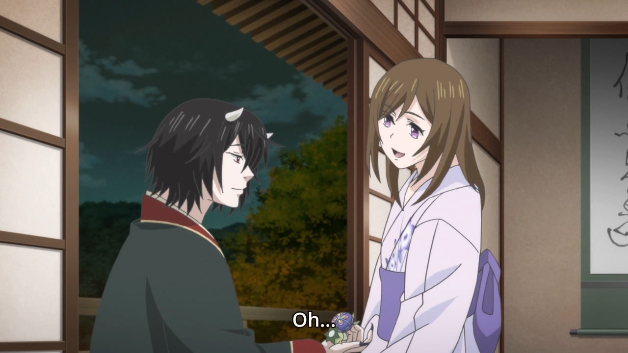 — It’s kinda weird that Aoi is now talking about how she hasn’t decided whether or not to marry Odanna. I guess repaying her grandfather’s debt is now mutually exclusive to their courtship. If she’s going to fall in love with him — and this certainly looks to be the case — I just wish he would meet her halfway. Like maybe he spends a bit of time with her in the apparent realm, and she can introduce him to all sorts of fun stuff like… I dunno, those crazy ramen commercials they have on TV nowadays. This show, however, is nothing but a love letter to a made up universe, so Aoi may as well throw away her old life. Don’t even think about it. Don’t even bother with your old friends, education, job, etc. Whatever dreams she had before she came here are now in the trash can.